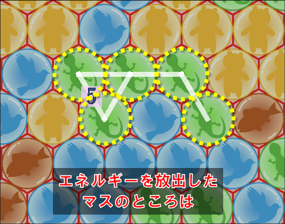 つながりのエネルギーは、たくさんあればあるほど、どんどん大きなエネルギーが放出されていきます。なので、同じ色がたくさんつながっていた方がどんどん強くなりますし、さらに同じ色が密集するような形になっていた方がどんどん強くなります。