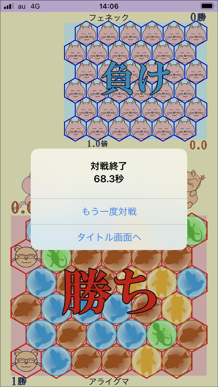 通信速度というのは常に一定ではなく、通常時でも、ときどき少し遅くなったりすることがあります。また、自分の端末の動作が少し遅くなったり、相手の端末の動作が少し遅かったりする場合などもあります。オンライン対戦中、相手の状態が1秒以上取得できなくなると、画面に「時間調整中」と表示され、対戦が一時停止します(相手の情報が取得できるまで待ちます)。一時停止が10秒以上続くと、相手との通信が正常にできない状態と判定され、対戦は終了になります。