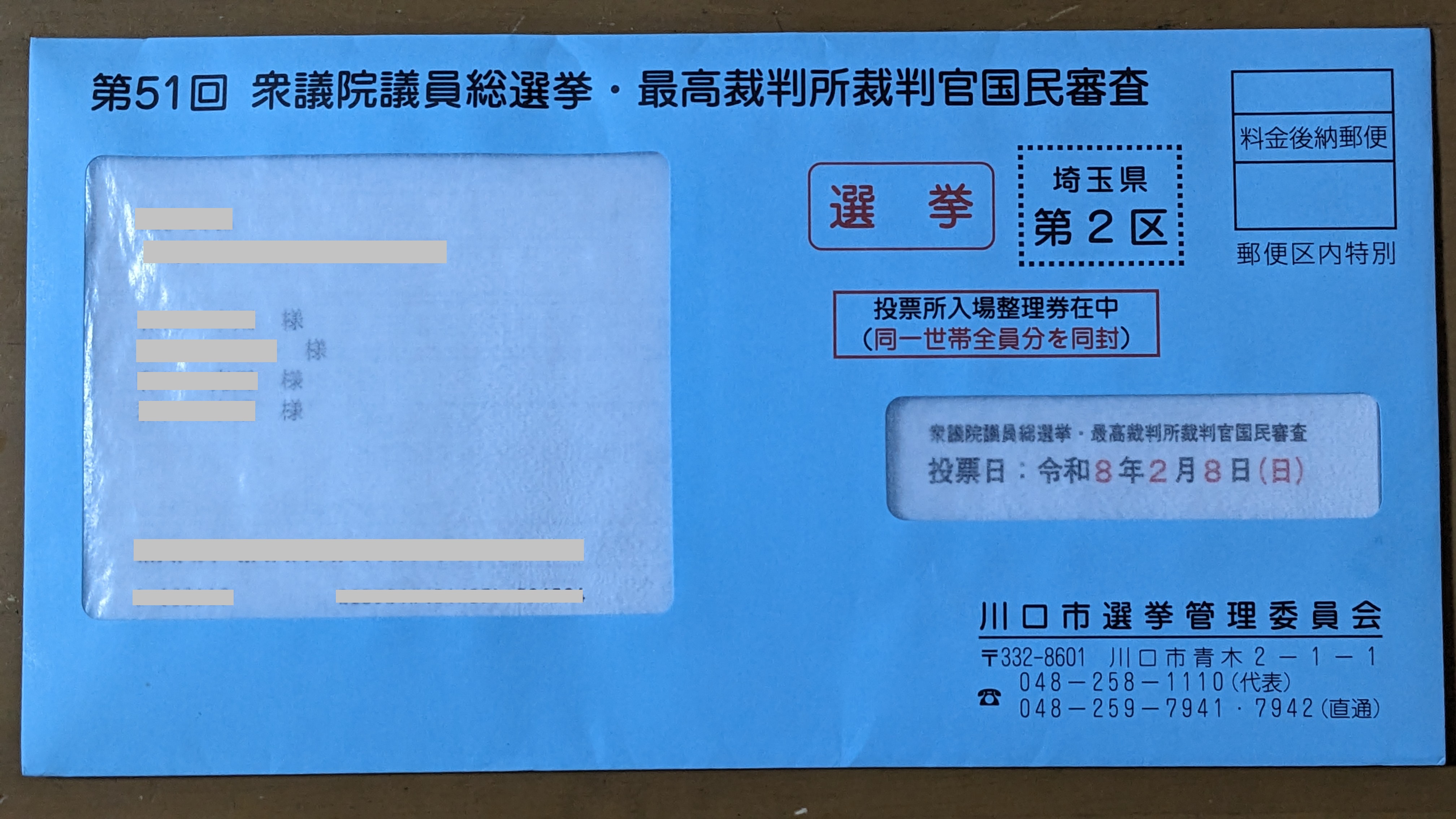 まあ、地域によっては、封筒じゃなくて、はがきで送られてくるところもあるらしいかな。「投票所入場整理券」っていう呼び名とはちょっと違う呼び名のところもあるかも。