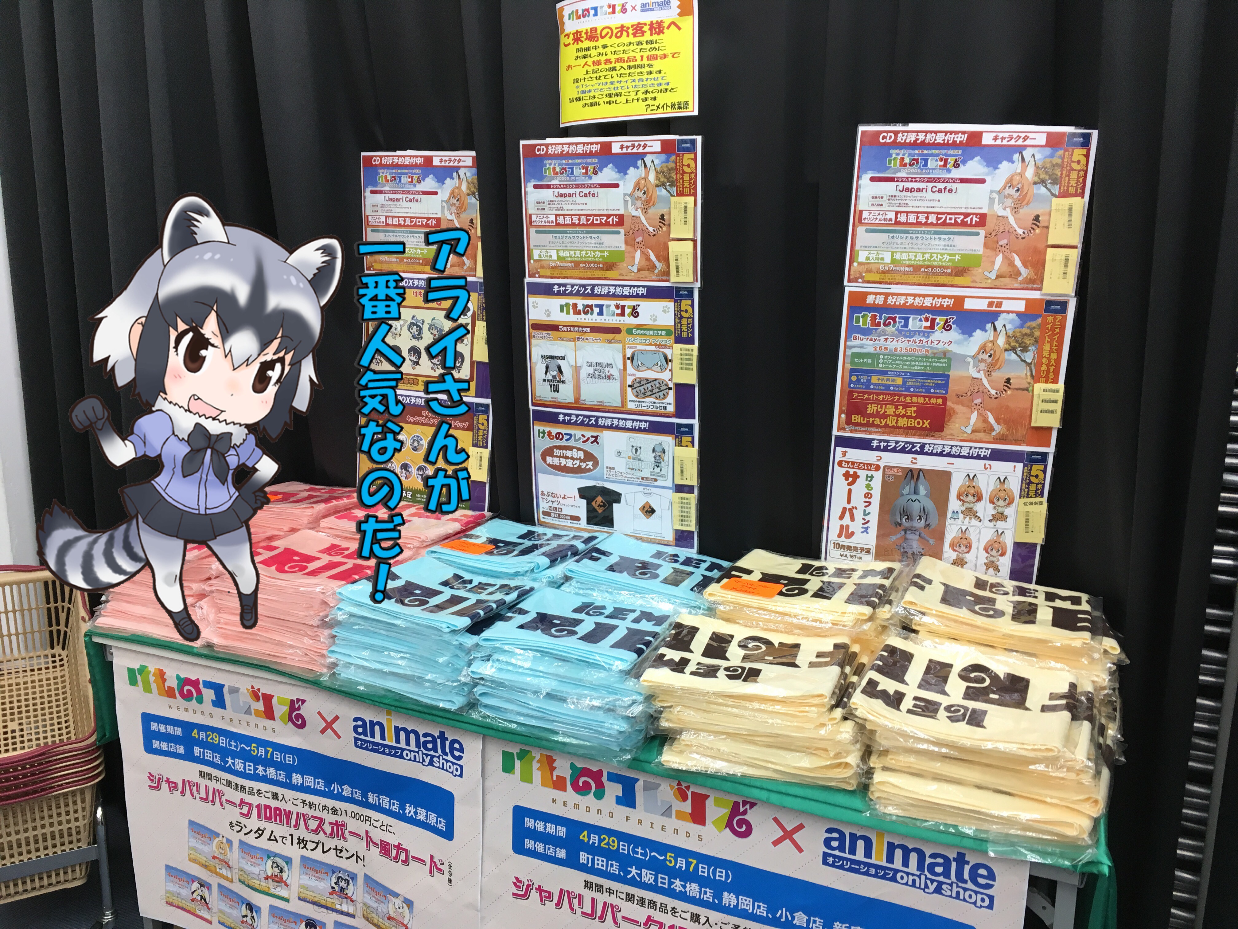 秋葉原のアニメイトの、「けものフレンズ×animate」オンリーショップ[2017年4月29日(土) 〜2017年5月7日(日)]。地下1階でやってます。