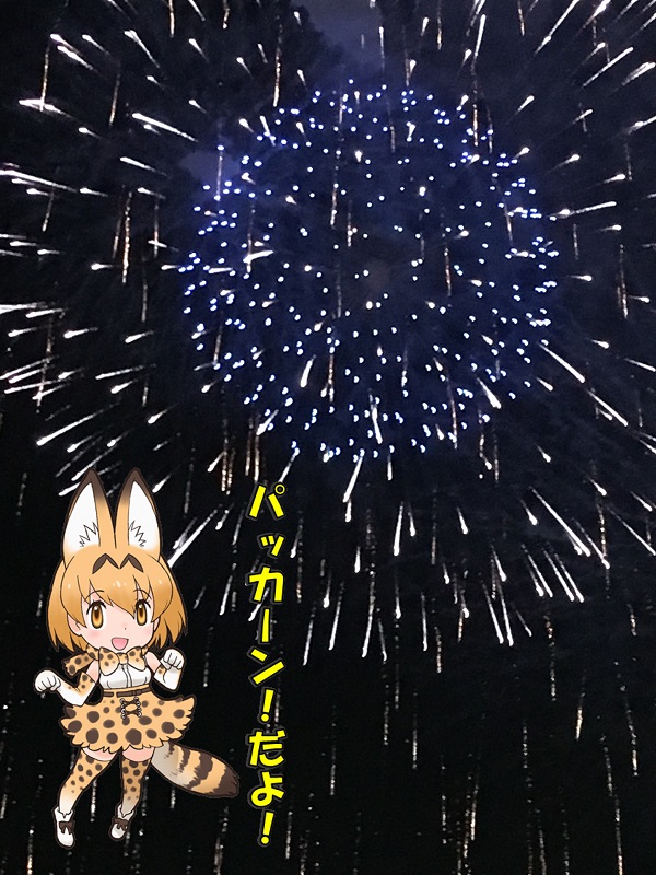 色のついた打ち上げ花火が開く瞬間の写真をうまく撮れば、けものフレンズでセルリアンをパッカーンと倒した時みたいな感じの写真が撮れるかもしれないと思い、「おすすめの場所をめぐろう」というスマートフォン用アプリを使って撮ってみた合成写真です。