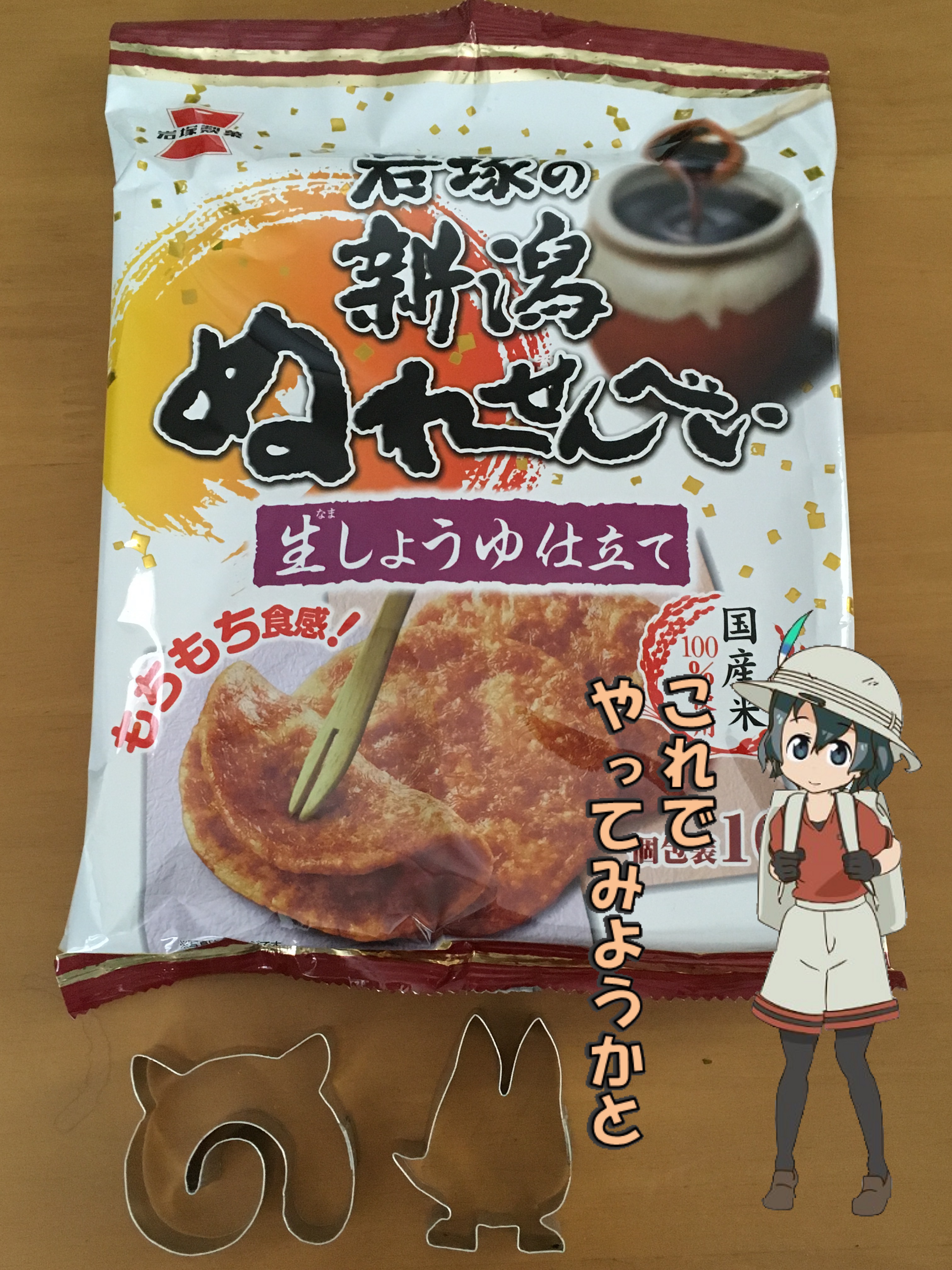 普通のぬれせんべいを、けものフレンズ的な型で型抜きしたら、けものフレンズ的なぬれせんべい(じゃぱりぬれせんべい?)ができるのではないかと思い、やってみました(型を作った時の写真はこちらのページ)。その過程を、「おすすめの場所をめぐろう」というスマートフォン用アプリを使ってキャラクターとの合成写真で撮ってみました。