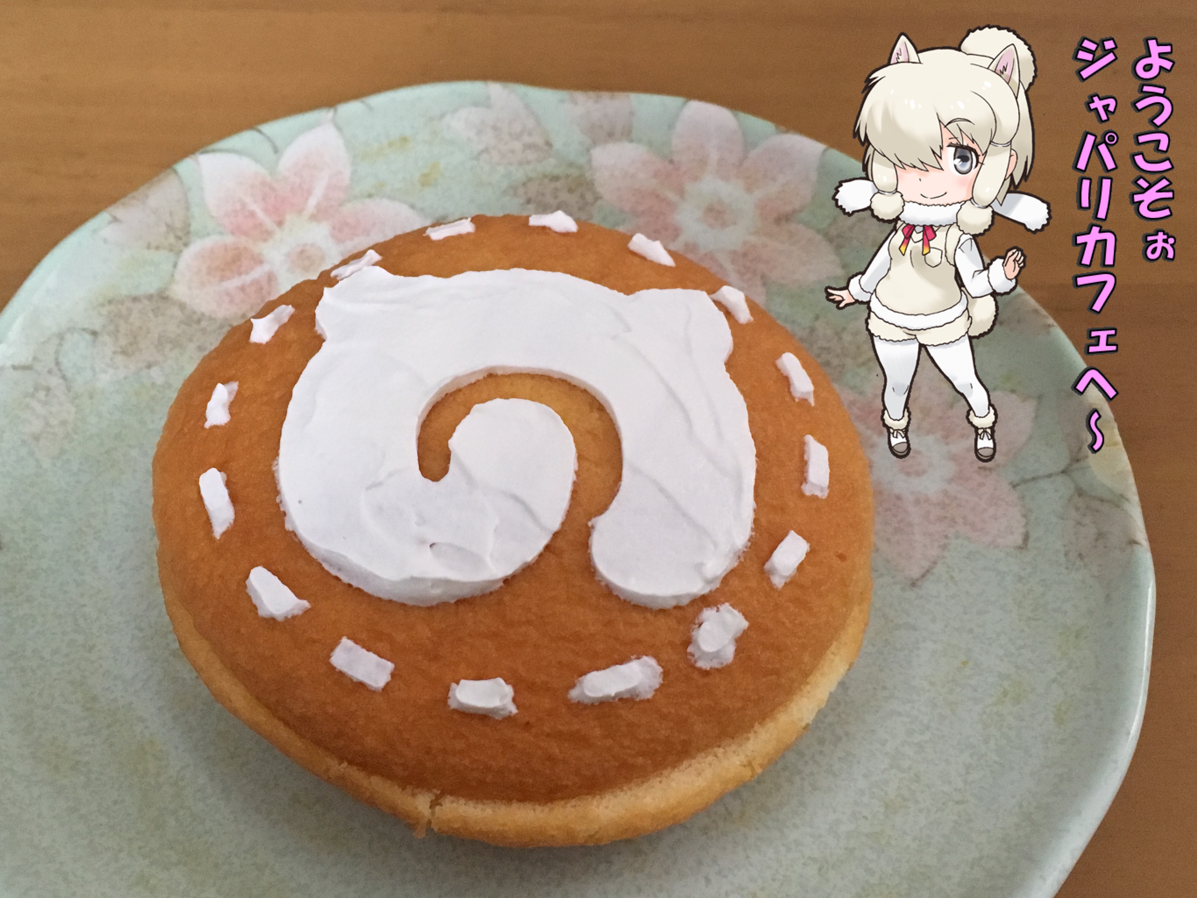 ももブッセの上に、けものフレンズのじゃぱりまんデザインを切り抜いた食品用ラップフィルムを置いてホイップクリームを乗せたら、じゃぱりまん的な感じ(じゃぱりももぶっせ?)になるのではないかと思い、やってみました。その過程を、「おすすめの場所をめぐろう」というスマートフォン用アプリを使ってキャラクターとの合成写真で撮ってみました。