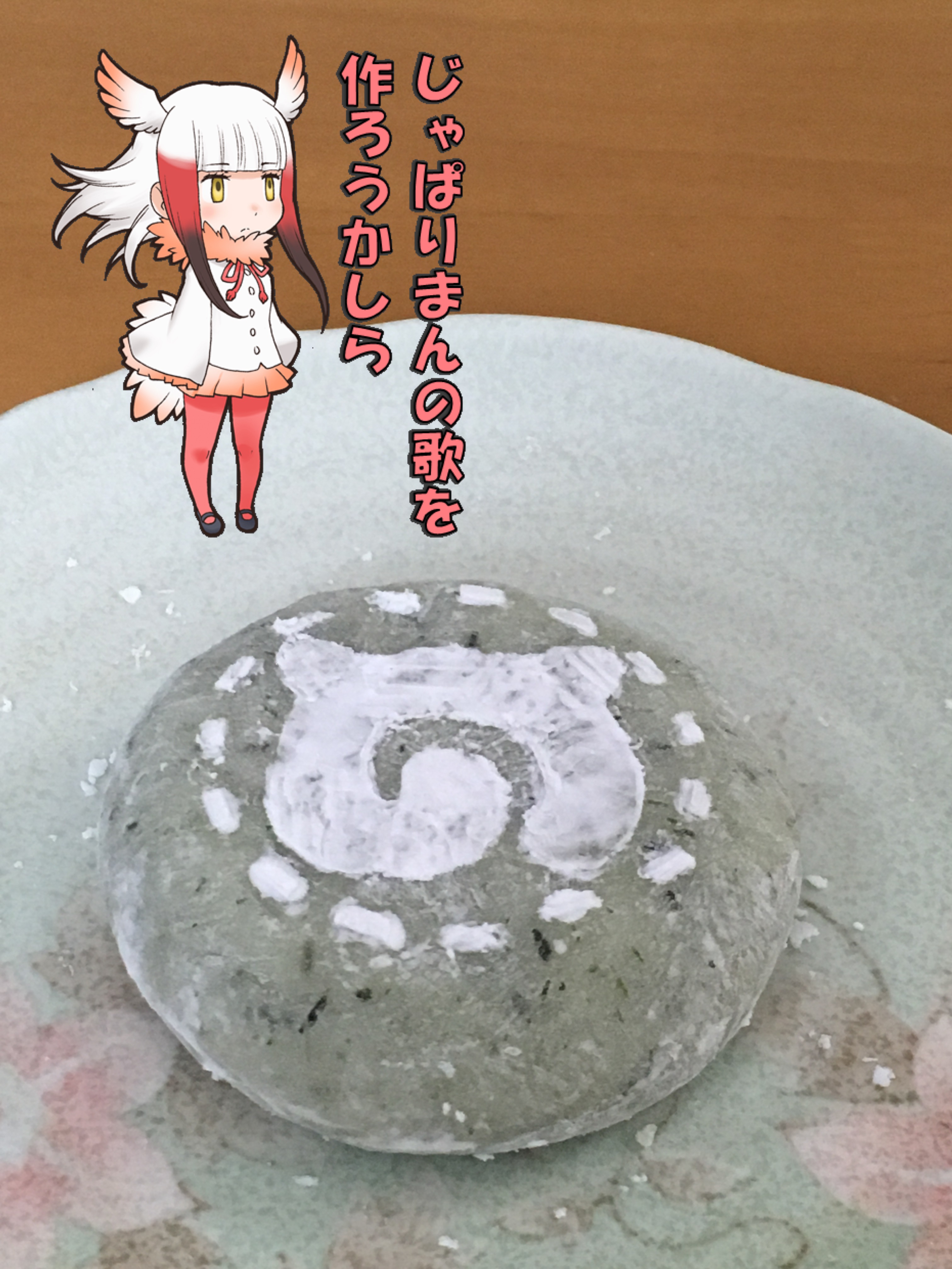 白い粉のかかったよもぎあんこ餅から、白い粉を一旦取り、けものフレンズのじゃぱりまんデザインを切り抜いたクリアファイルを置いて、白い粉をかけなおしたら、じゃぱりまん的な感じ(じゃぱりよもぎあんこもち?)になるのではないかと思い、やってみました。その過程を、「おすすめの場所をめぐろう」というスマートフォン用アプリを使ってキャラクターとの合成写真で撮ってみました。