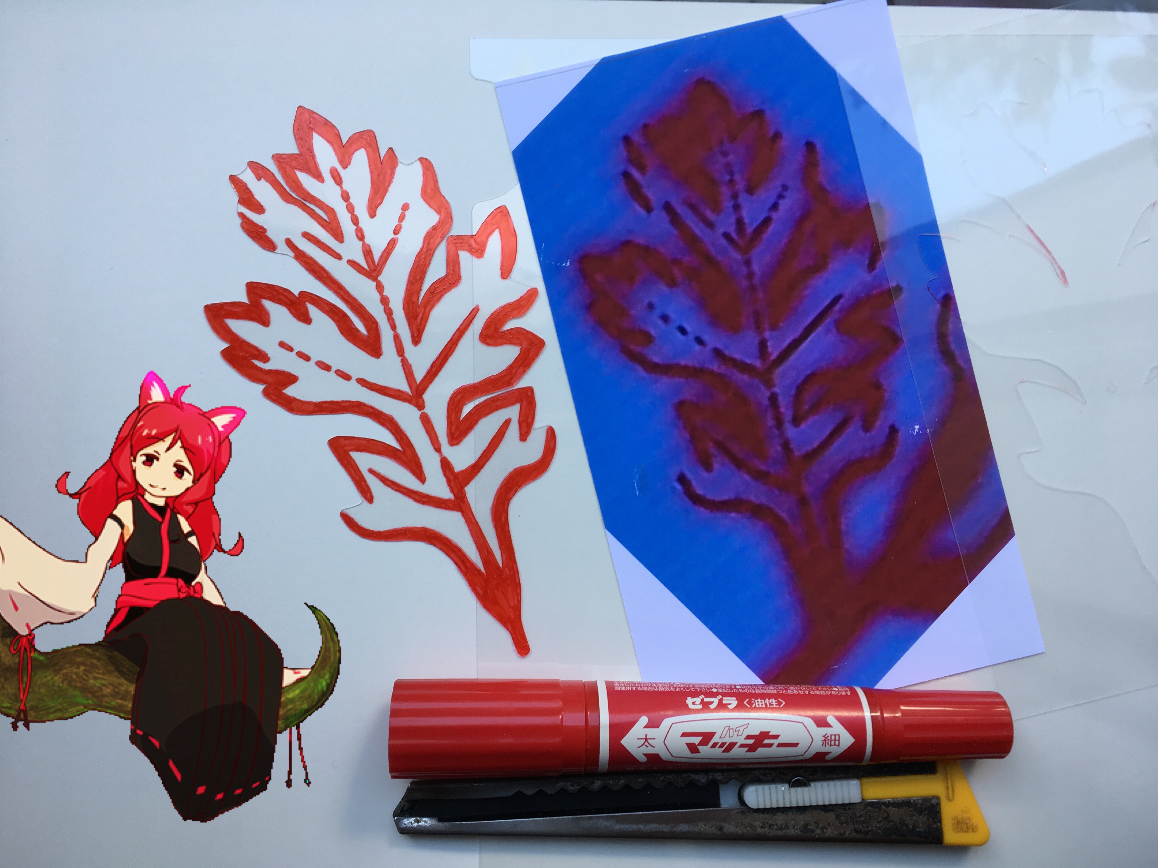 透明なクリアファイルをカッターで切り抜いて、赤いマジックペンで模様を塗って、あかケムリクサっぽい物を作ってみました。