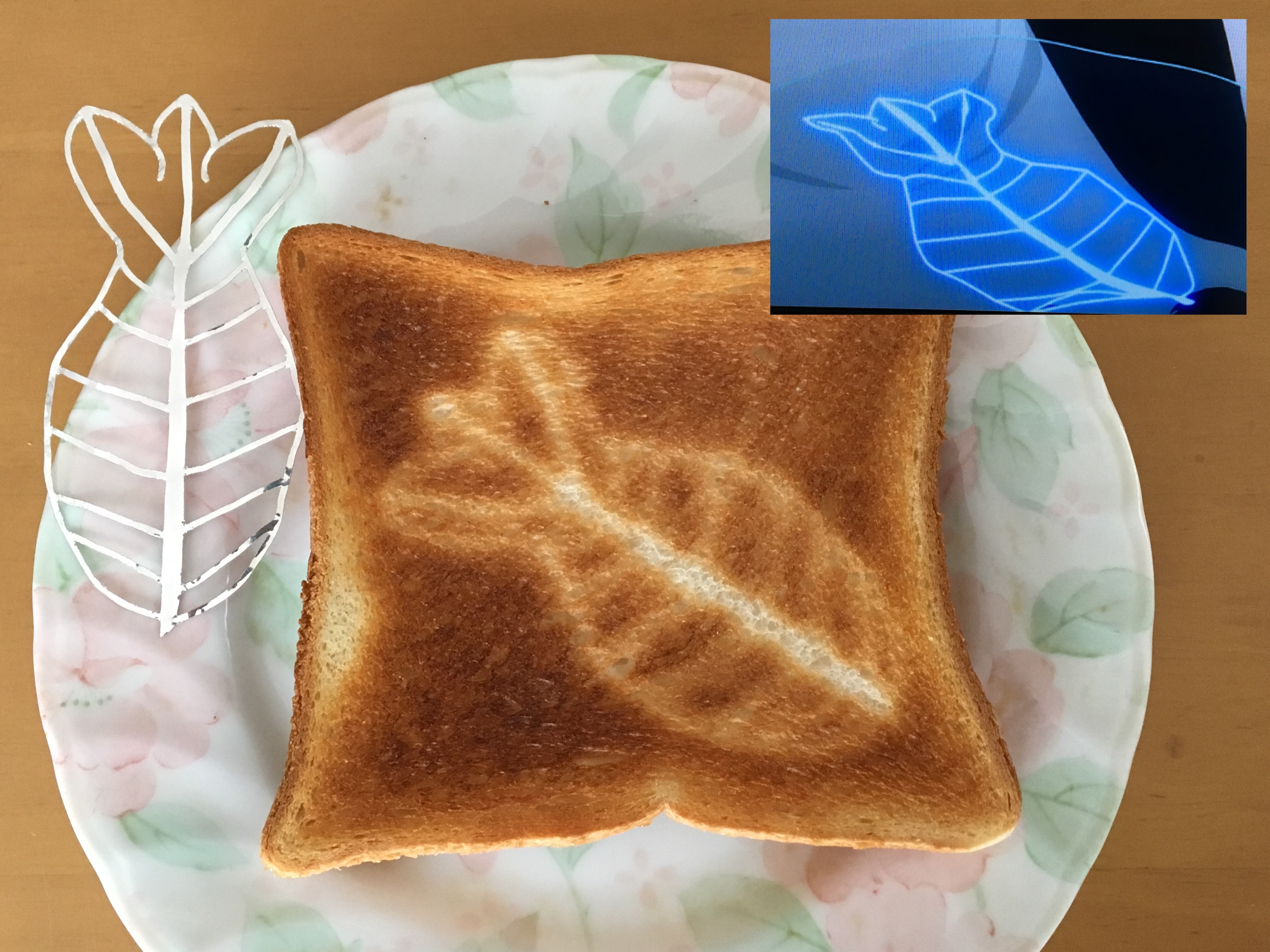 食パンの上にアルミ板を置いてオーブントースターで焼いて、あい(藍)ちゃんケムリクサっぽい物を浮かび上がらせてみたのを撮った写真です。